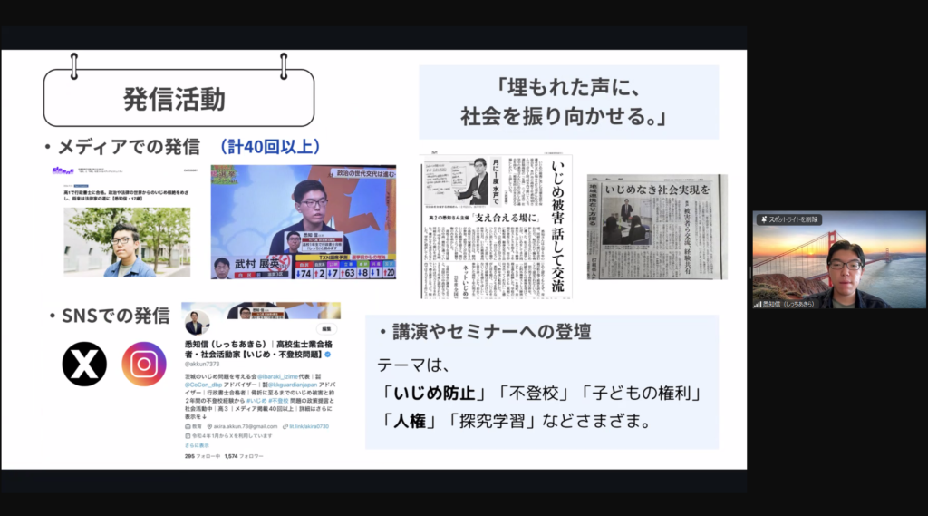 • 同じ思いを未来の子どもたちにさせたくないという強い気持ちから、「当事者だからこそ伝えられること、発信できることがある」との考えに至った。その経験と思いを原動力に、社会活動家として「いじめ撲滅と不登校支援の拡充、被害当事者が泣き寝入りしない社会へ」を目指して活動を開始。