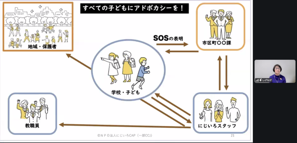 今、国が進めるアドボカシーは、社会的養護にいる子どもたちが対象ですが、本来ならすべての子どもたちに当たり前になってほしいと思います。CAPは、フォーマルアドボカシーの立場にある先生方と一緒に、どうやって子どもの権利、子どもの意見表明を大事にしていくのか、あるいは地域・保護者といったインフォーマルな方々にどんな協力をしてほしいのか、どんな現状を認識してほしいのかを自治体の責務として、トレーニングされたCAPスタッフがお話しします。その上で、子どもたちにピアアドボカシー、セルフアドボカシーに向けて発信をします。しかし、日本ではおとなに権利が浸透していないので難しいです。だから地味でも根気よくこれまでの臨床と子どもたちの声をたくさん聞いてきたこと、新しい情報をおとなに届けることが役割だと思っていいます。